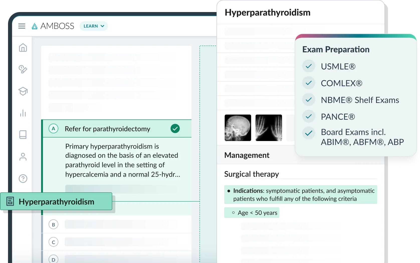 The United States Medical Licensing Examination (USMLE®️) is a joint program of the Federation of State Medical Boards (FSMB®️) and the National Board of Medical Examiners (NBME®️). The Comprehensive Osteopathic Medical Licensing Examination (COMLEX-USA®️) is administered by the National Board of Osteopathic Medical Examiners (NBOME®️). Additionally, the National Commission on Certification of Physician Assistants (NCCPA®️) governs the Physician Assistant National Certifying Exam (PANCE®️) and related certifications. ABIM®️ is a registered trademark of the American Board of Internal Medicine. ABFM®️ is a registered trademark of the American Board of Family Medicine. None of the trademark holders mentioned are affiliated with AMBOSS.